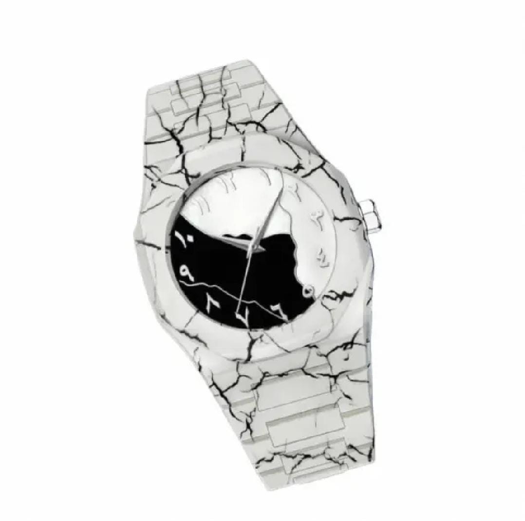 This elegant white wristwatch blends modern minimalism with artistic dial design. The premium white strap gives a clean, stylish look, while the unique black-and-gold abstract dial adds a luxurious touch. Perfect for daily wear and special occasions.