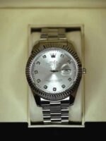 Highlight key features – model, material (stainless steel), dial (silver with diamond indices), movement (automatic), waterproof rating, and certification (Superlative Chronometer). Mention it comes with a box and authenticity papers if applicable.